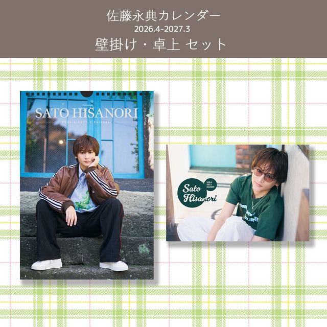 佐藤永典2026.4-2027.3カレンダー ①壁掛けタイプ(A4サイズ)表紙込み13ページ、ハンガーリング付き1冊 ②卓上タイプ(ポストカードサイズ)表紙込み14ページ、プラケース付き1冊 【特典】 L判ブロマイド1枚(ランダム全3種) ※3/28のイベント特典ブロマイドと同じ絵柄のブロマイドになります